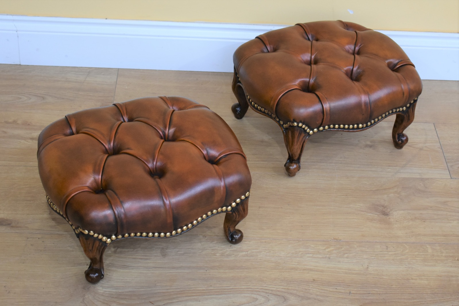 Pair of Victorian Hand Dyed Deep Buttoned Antique Brown Leather Footstools