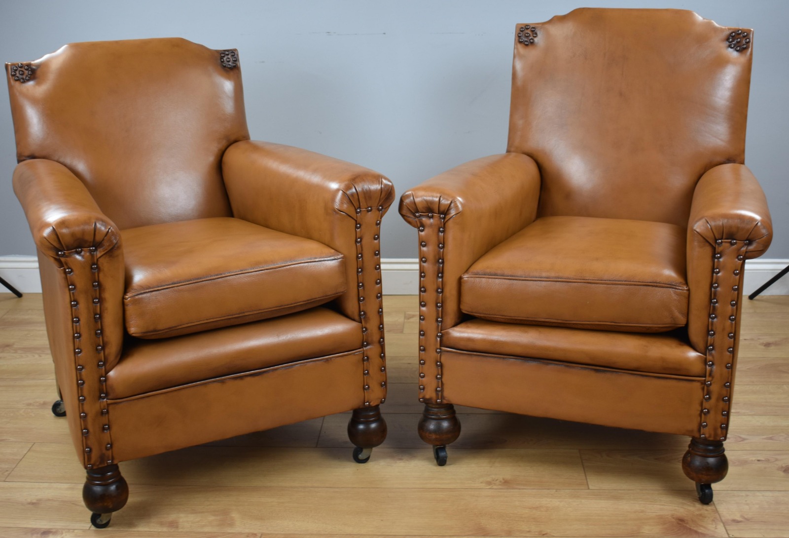 Pair of Victorian Ladies & Gents Tan Leather Armchairs