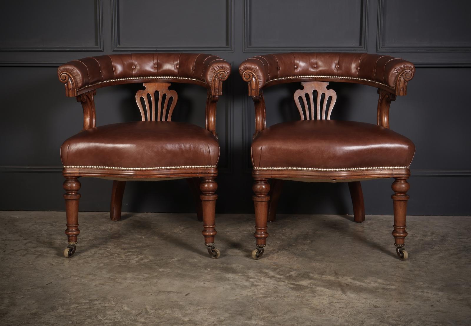 Presenting a stunning pair of Victorian Captains Desk Chairs, expertly crafted from solid mahogany and featuring new, high-quality brown leather upholstery. These chairs combine timeless elegance with exceptional comfort.