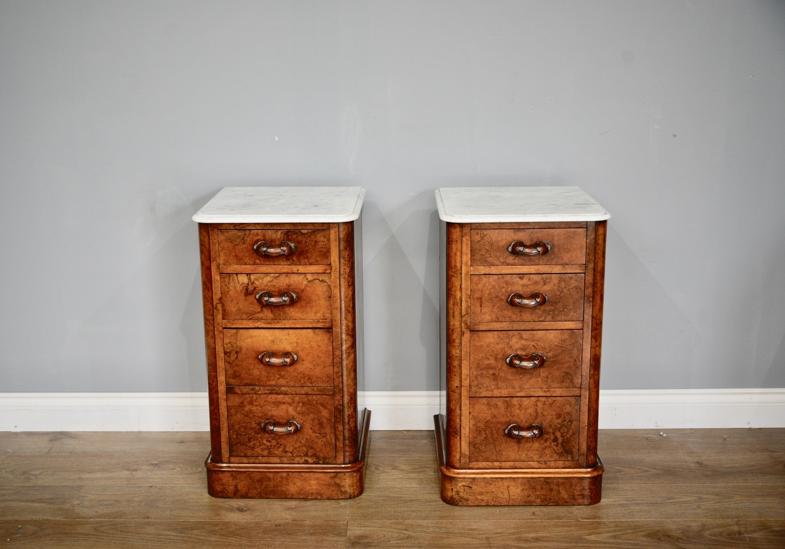Pair of Victorian Marble Top Burr Walnut Bedside Chests of Drawers