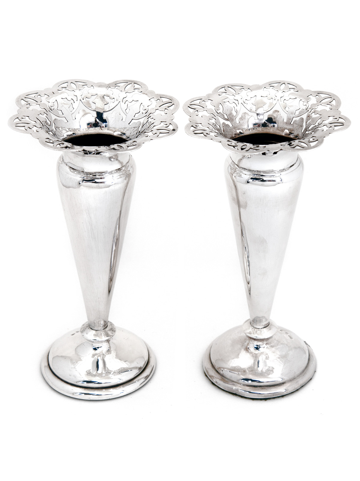 Pair of Victorian Silver Trumpet Shaped Vases with Pierced Floral Petal Shaped Flared Rims (1 of 1)