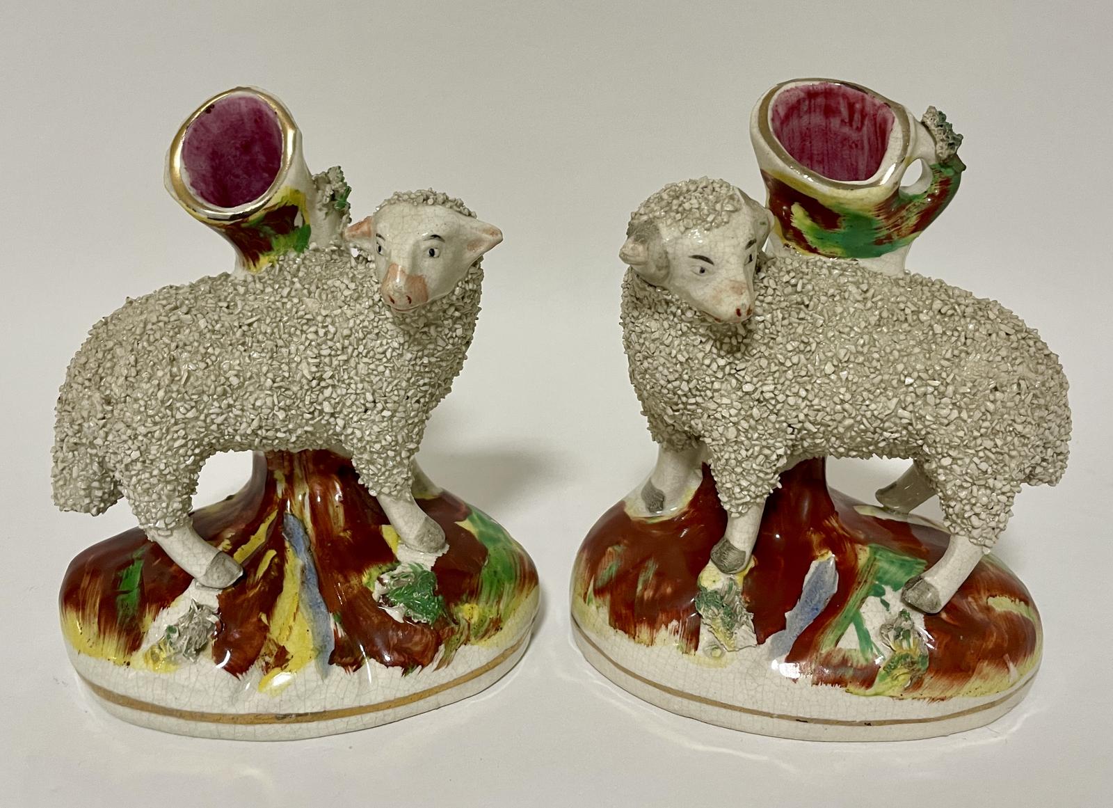 Pair of Victorian Staffordshire Sheep Spill Vases