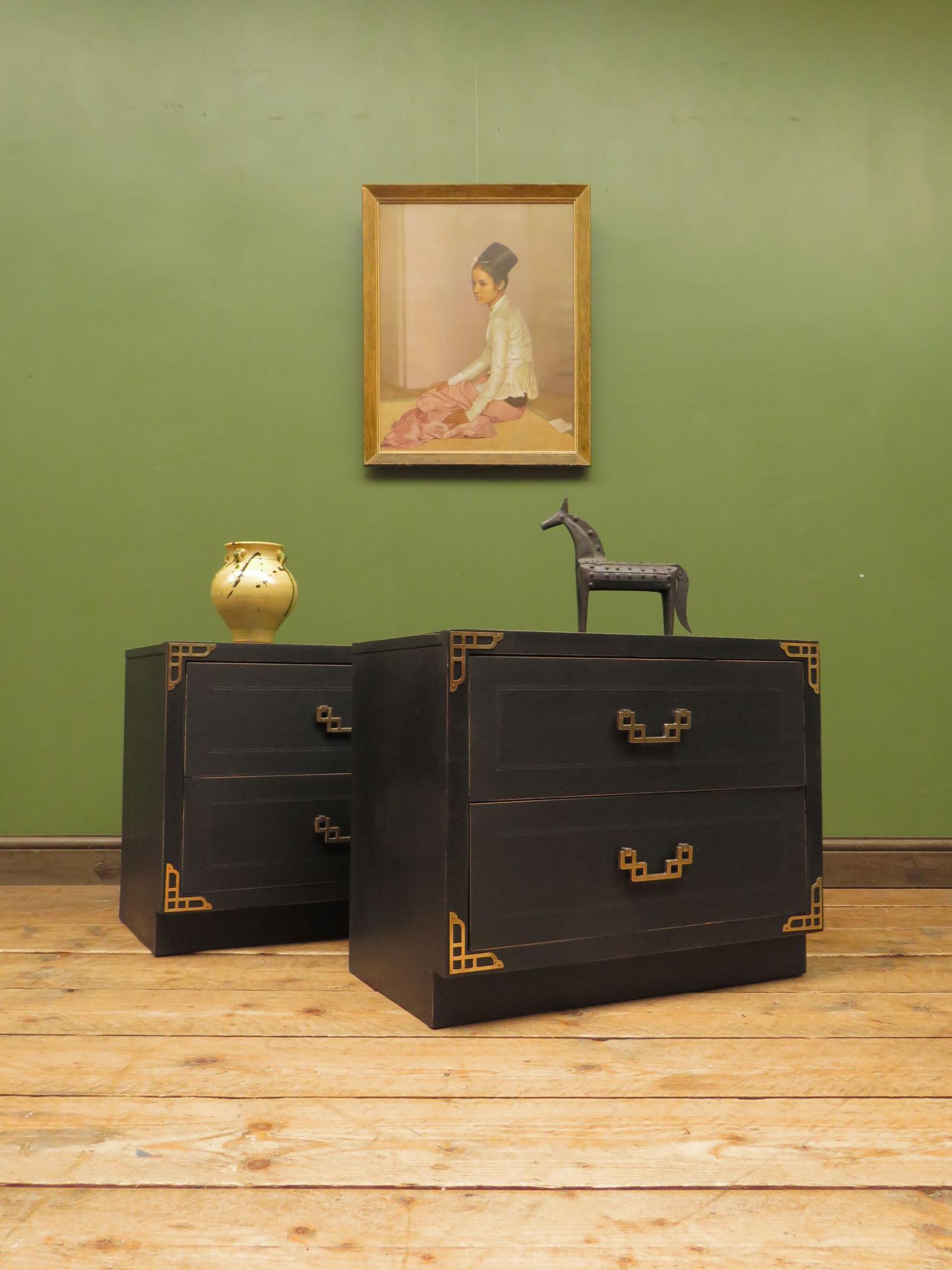 Pair of Vintage Chinese Style Black Painted Bedside Chests, Gothic Shabby Chic