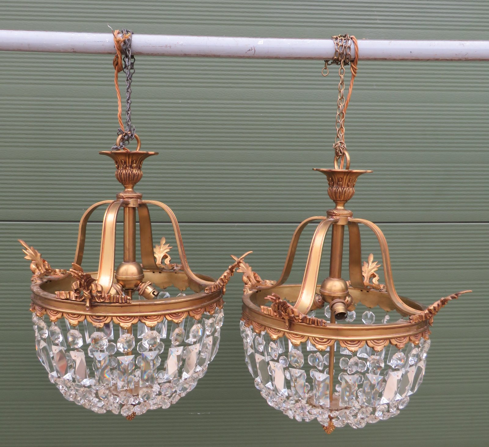 Pair of Vintage Cut Glass Brass Basket Chandeliers