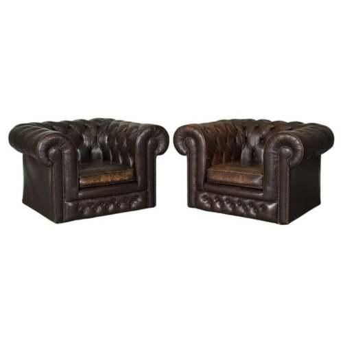 Pair of Vintage Distressed Brown Leather Chesterfield Gentlemans Club Tub Armchairs