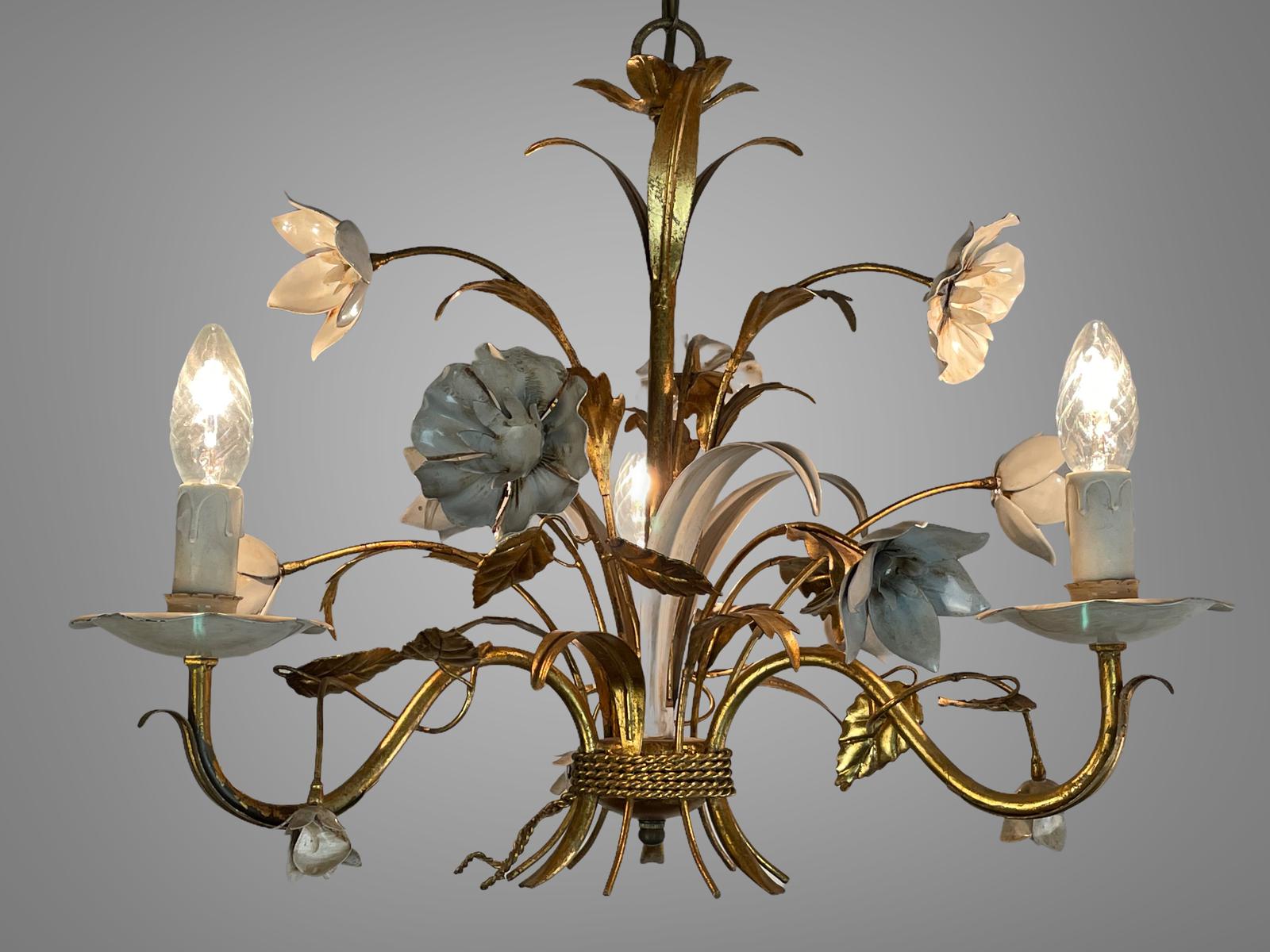 Pair of Vintage French 3 Arm Gilt Toleware Ceiling Light Chandeliers