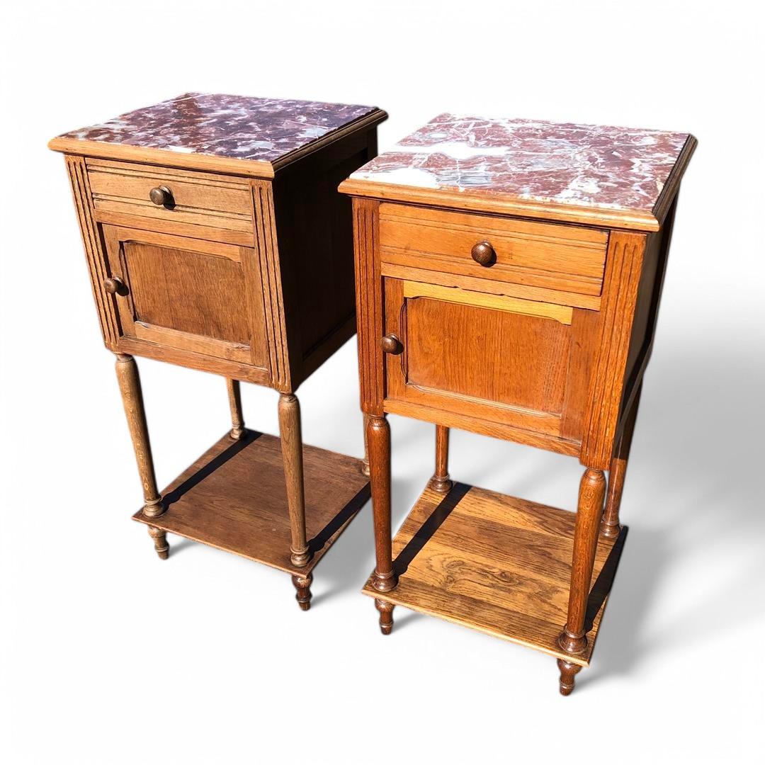 Pair of Vintage French Oak Bedside Tables with Red Marble Tops - Near Match