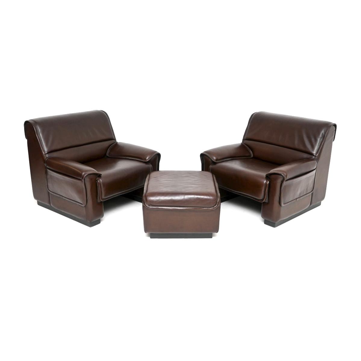 Pair of Vintage Leather Armchairs & Stool by De Sede