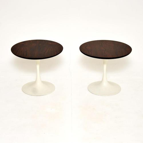 A stylish and very well made pair of vintage rosewood tulip side tables by Arkana. They were designed by Maurice Burke, and were made in England in the 1960s. The quality is superb, they are a very useful size and have a beautiful design. The circular rosewood tops have stunning grain patterns, they stand on off white weighted metal bases. We have had the wood stripped and re-polished to a very high standard, there is some minor surface wear to the bases here and there. Overall the condition is excellent for their age. The wood is Santos rosewood, which does not require a CITES or article 10. Width – 46cm, 18 inches Depth – 46cm, 18 inches Height – 38cm, 15 inches