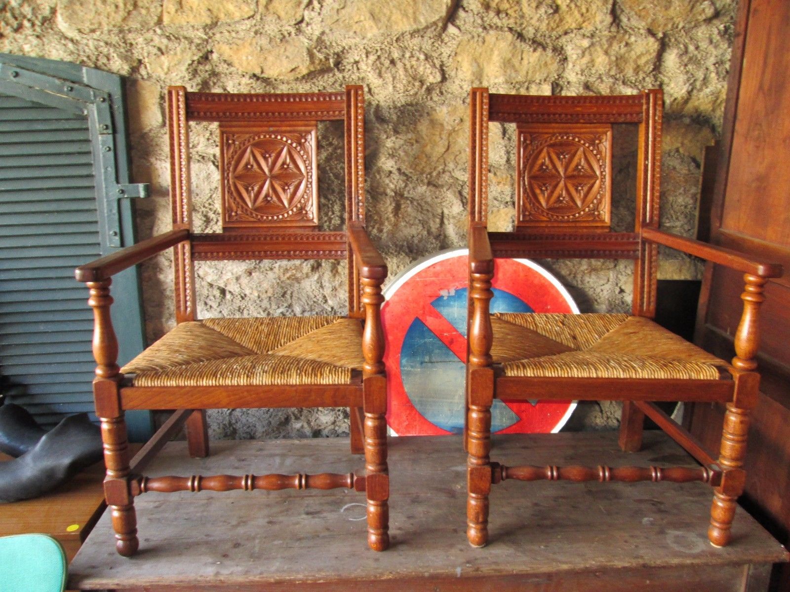 Pair of Walnut Carved Country Arms Chairs with Rush Seats 1940s