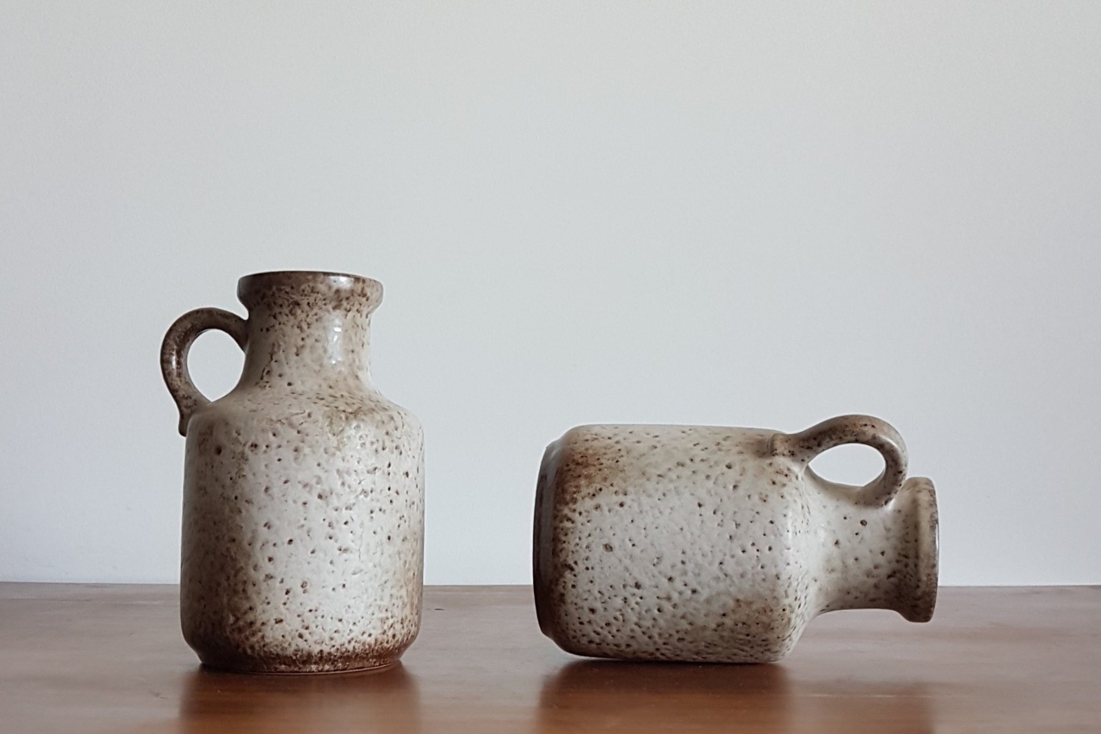 Pair of West German Scheurich Gloss Chocolate & Matte Cream Foam Glaze Ceramic Pitcher Vases