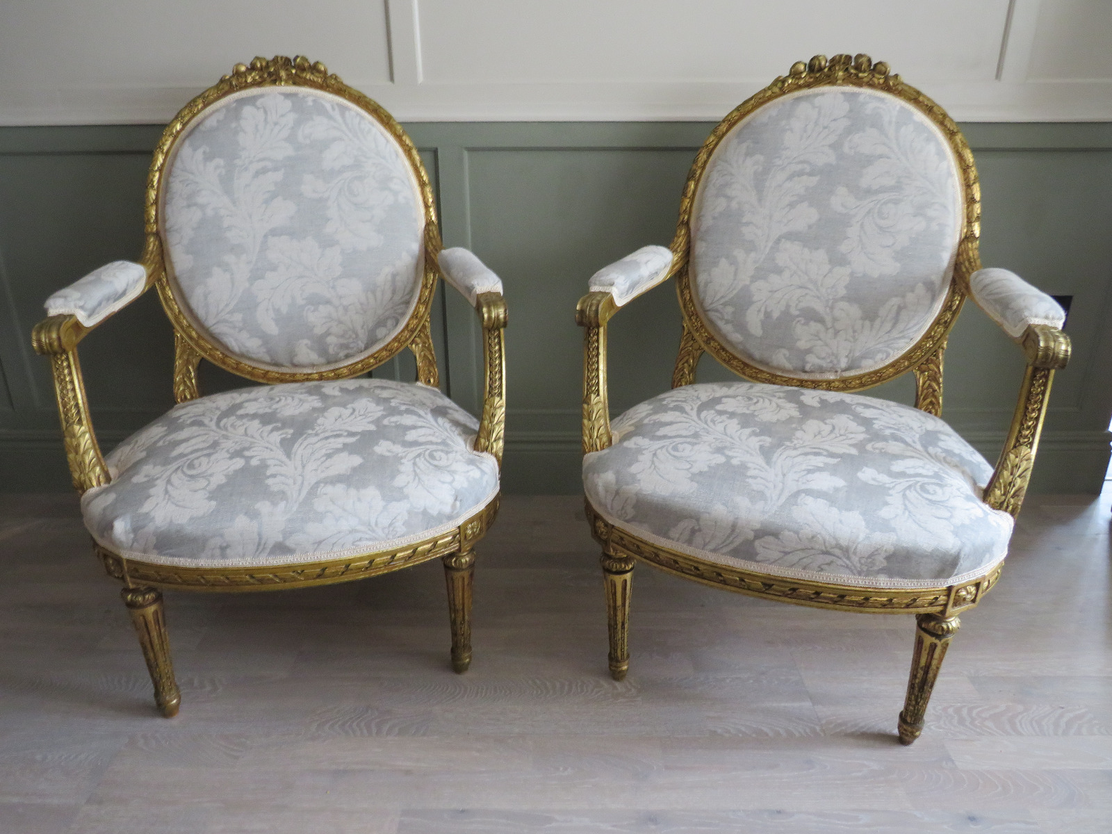 Pair of Wide Gilt Open Armchairs Restored & Upholstered