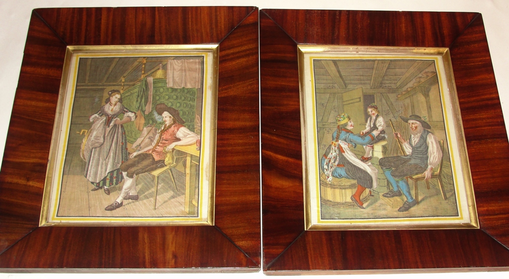 Pair of William IV Coloured Prints on Linen in Original Rosewood Frames