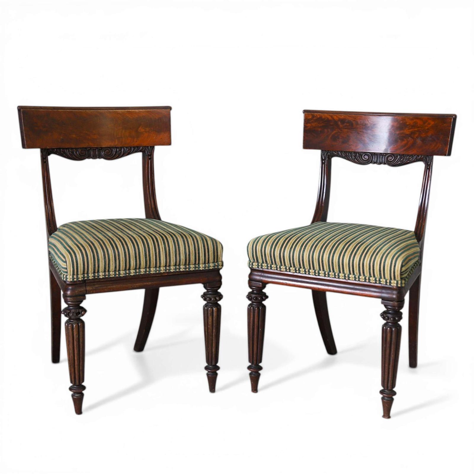 Pair of William IV mahogany side chairs, c.1830, with flame mahogany backs and Regency stripe upholstery - Elegant, robust and full of period character