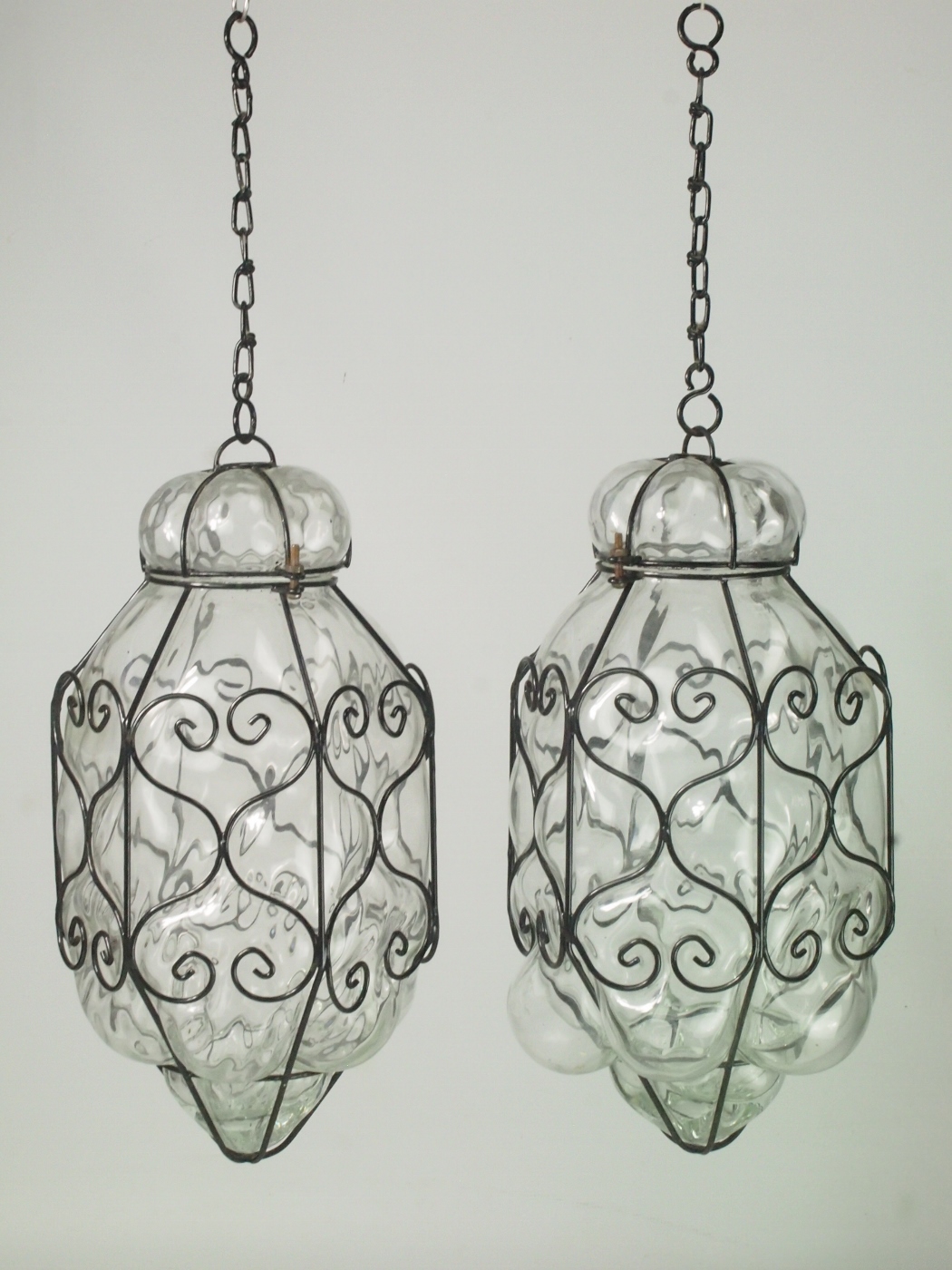 Pair of Wire Framed Glass Hanging Lamps c.1920 / 1930