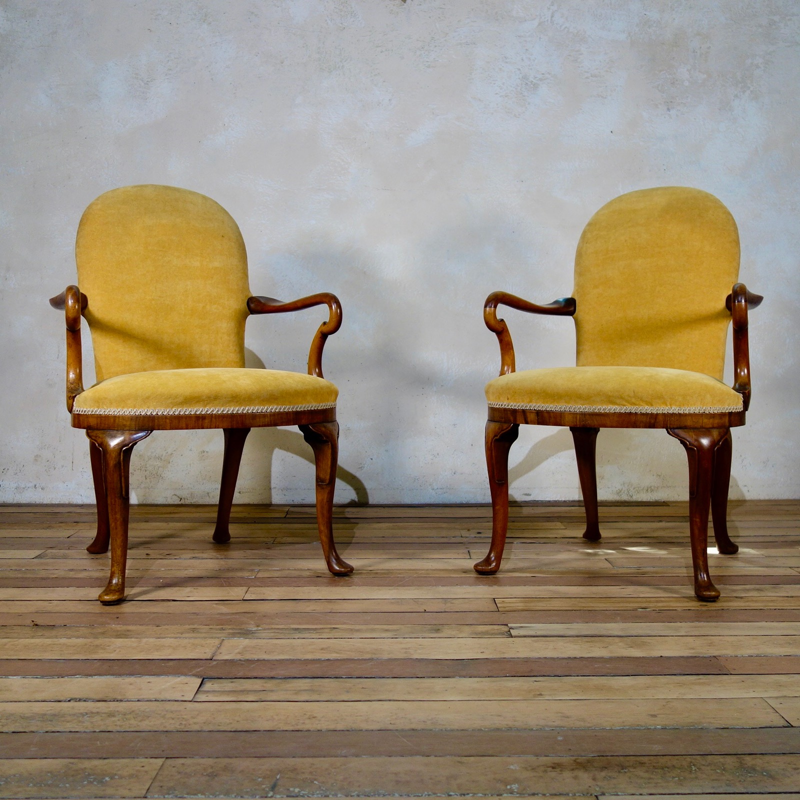 Pair of Yellow Upholstered George I Style Shepherd Crook Armchairs Chairs (1 of 1)