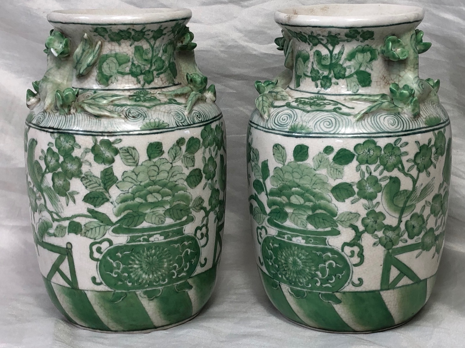 Pair Unusual Green & White Porcelain Lotus Oriental Ming Dynasty Style Vases
