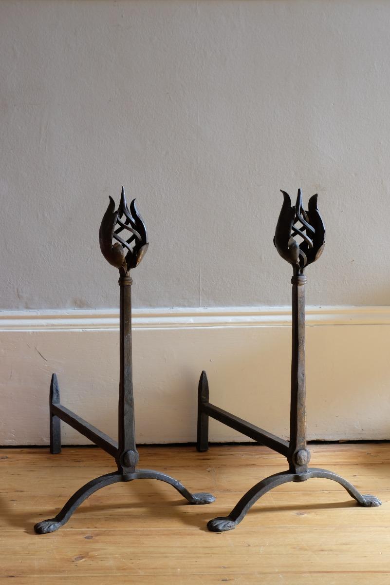 Pair Wrought Iron Fire Dogs With Open Foliate Finials