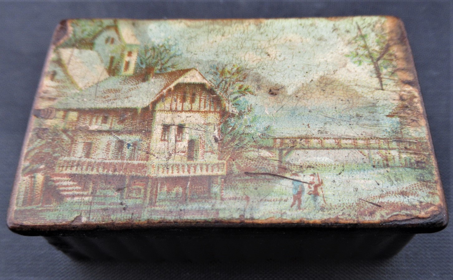 Papier Mache Snuff Box, German c.1820, Printed Lake Scene to lid