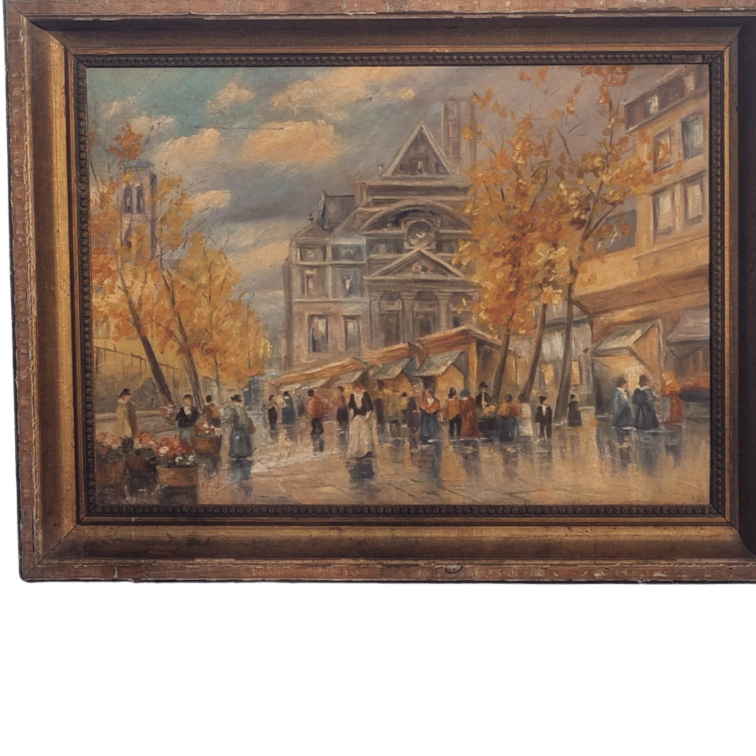 Paris Street Signed Schonberg Mixed Media Painting on Cardboard Paper – Paris Street Market Scene with Autumn Trees – Impressionist Style French Cityscape