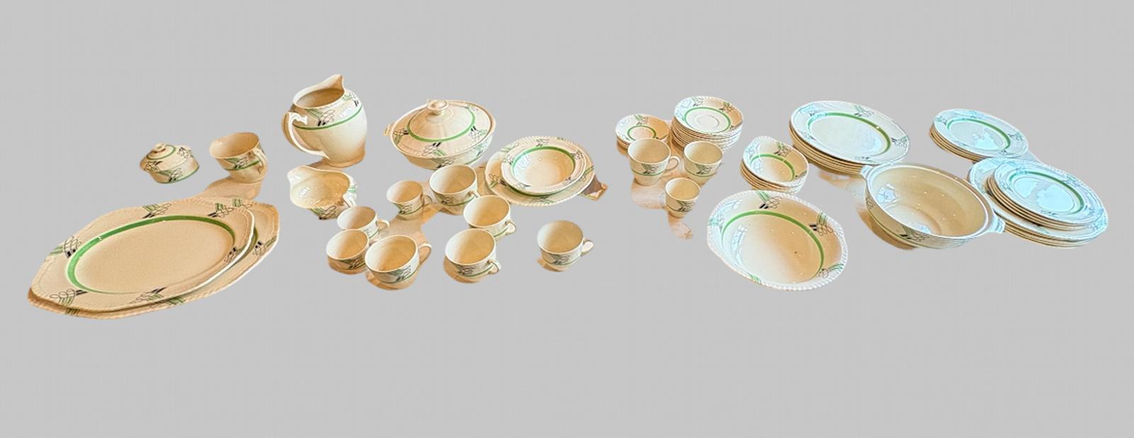An attractive Art Deco British earthenware made by Alfred Meakin, produced in England in a pattern called 'Perth', which is part of Meakin's Vanity Ware range Late 1920's with cream ivory glaze bold green banding, black linear scroll and stripe motifs and subtle scalloped wavy rims consisting of: 6 Dinner Plates 26 cm Diameter, 5 Starter Plates, 5 Medium sized side plates and 4 smaller side plates 18 cm Diameter. 11 Tea Saucers, 5 Coffee Saucers, 2 large and 4 small cups, 4 Coffee cups Small Milk Jug, Gravy Boat, Sugar Bowl, Large Jug with chip to spout 6 Pudding/Soup Bowls, 2 Vegetable Dishes one with with lid, Salad Bowl and 2 Meat Dishes
