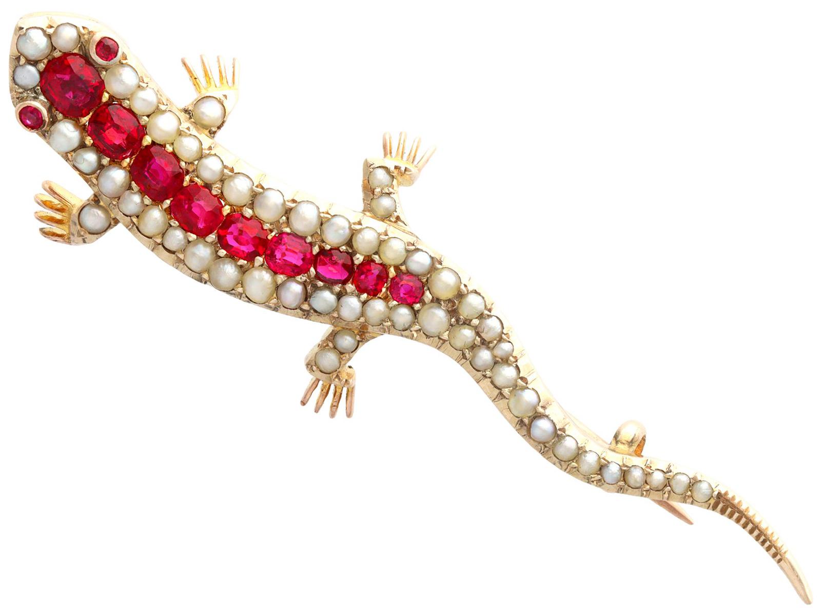 Pearl & 1.42ct Ruby, 9ct Rose Gold Lizard Brooch - Antique Victorian c.1885 (1 of 9)