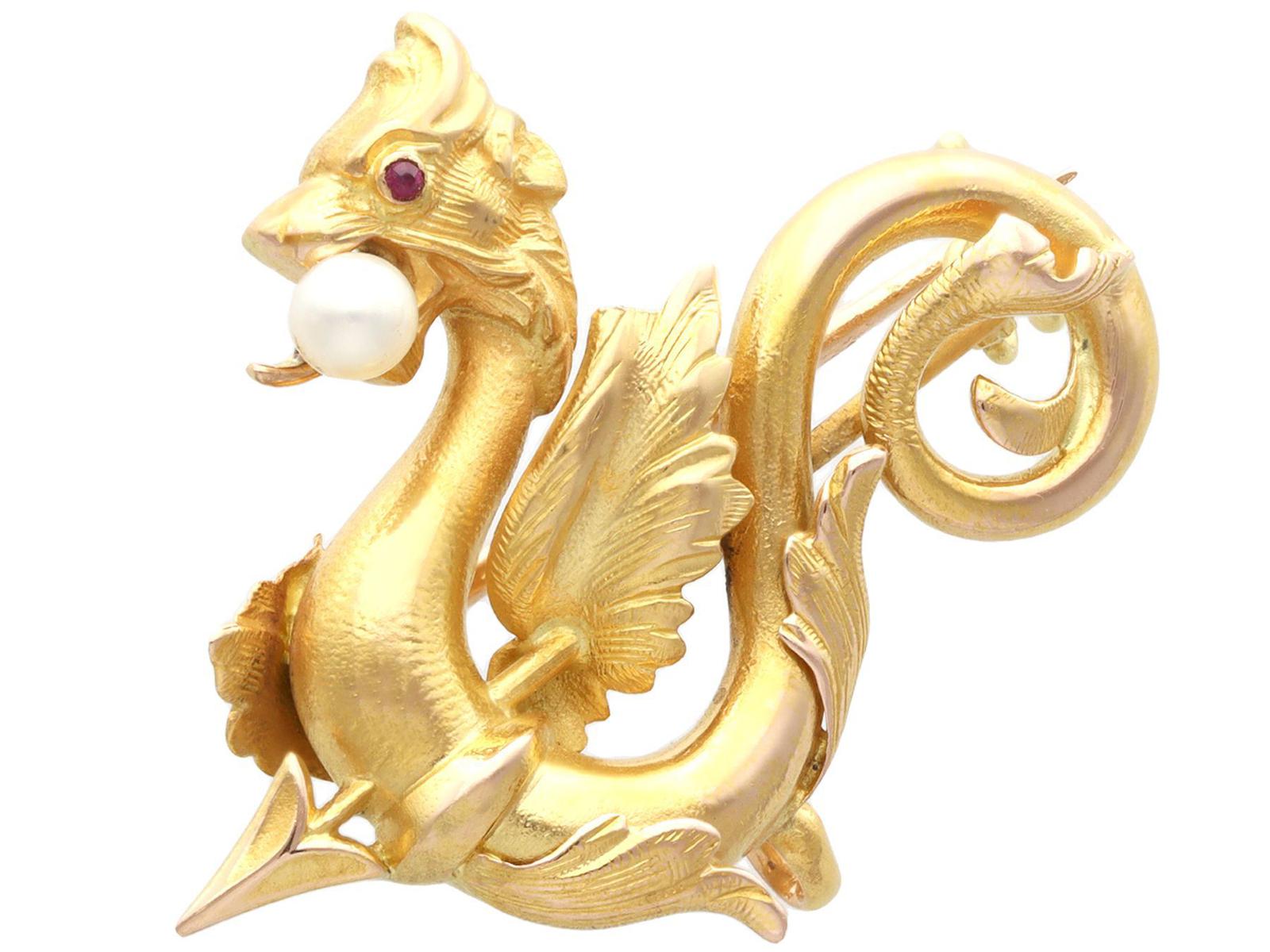 Pearl, Ruby & 21ct Yellow Gold Dragon Brooch - Antique c.1920 (1 of 9)