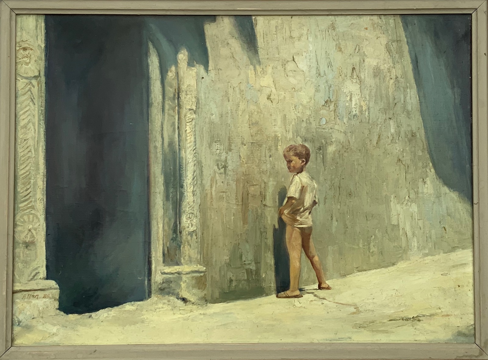 'Peeing Boy' Delightful Antique Oil on Canvas. Signed Allan & Dated. Original Frame