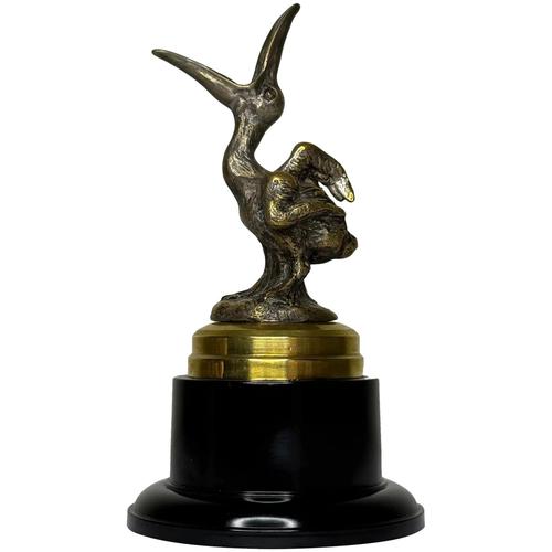 Fine Majestic Grace Spanish Antique Art Deco Ornithology Bird Pelican Mascot Sculpture On Stand by Antoine Bofill. Impress your clients & guests in your office or home with this adorable animal bird car mascot. A charming small size being 18 cm high and 13 cm wide. Signed Bofill on the Pelican by the known sculptor. Subject in the model form of a pelican bird with its beak open wide, it would have been originally mounted on an old classic automobile car radiator, it has been positioned on a brass stepped circular base with a later added lower resin stand for indoor display. The casting is superb made from fine brass metal, the round base stand which is made from resin. Circa 1925 early 20th century beginning of the Art Deco era. Antoine Bofill (1875-1925) a known Spanish artist & sculptor, he also joined the animalier movement focusing on depicting animals with a realistic & dramatic style, he is especially highly regarded for his small animal sculptures. Antoine Bofill was born in Spain in the great city of Barcelona during the year of 1875. He was a student at the Barcalona Fine Art Academy. He exhibited his works around Europe. It is also know that he also exhibited at the Paris Salon between the late 19th century and very early 20th century. His works have sold in galleries & auction houses around the world & fetch up to $25,000 US dollars. Pelicans (genus Pelecanus) are a genus of large water birds that make up the family Pelecanidae. They are characterized by a long beak and a large throat pouch used for catching prey and draining water from the scooped-up contents before swallowing. They have predominantly pale plumage, except for the brown and Peruvian pelicans. The bills, pouches, and bare facial skin of all pelicans become brightly coloured before the breeding season. So collectible & highly sought after by collectors. Having such a beautiful finish with charming patina. Provenance from a West Country Collector, Swatkins, high end southern auction & in collection of Cheshire Antiques Consultant LTD. We offer our clients exceptional professional customer service. Browse our exciting other Fine Art, antiques & collectibles available in our gallery. Dimensions in centimetres Height (18 cm) Width of base (13 cm) Depth of base (13 cm)