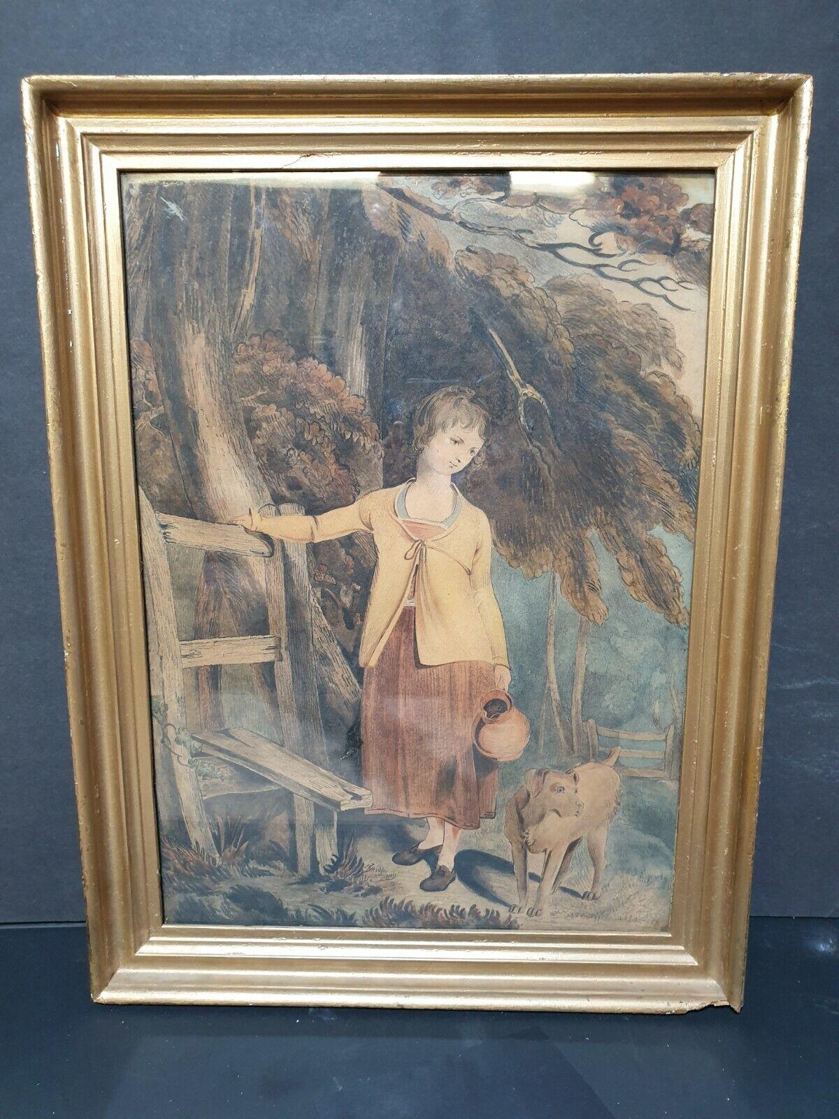 Pen Ink Painting of a Young Girl & Dog Watercolor Primitive English School 1850