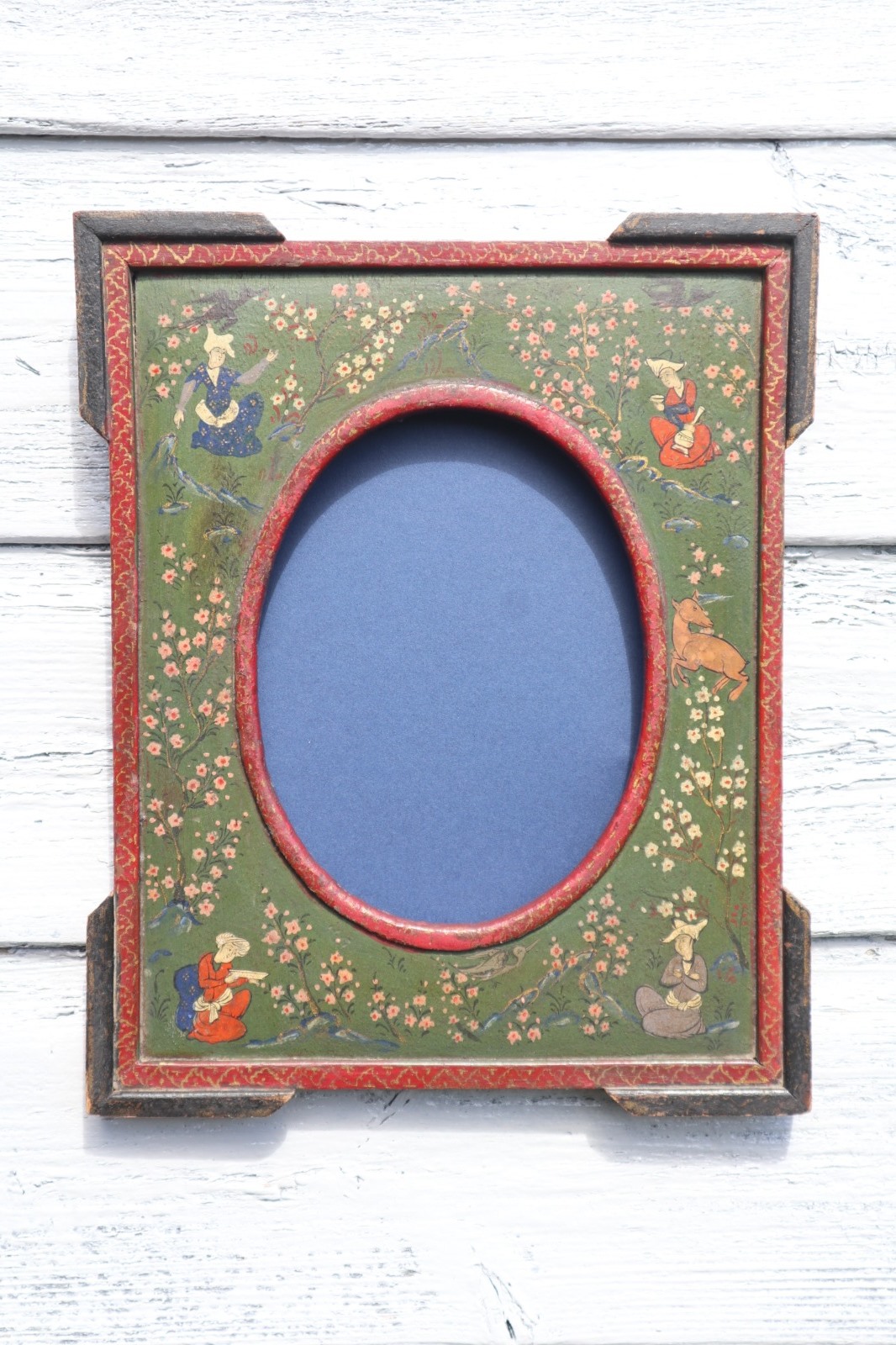 Persian / Middle Eastern, Wooden Oval Portrait Photograph Frame, Painted Miniature Figural and Floral Scenes c.1895