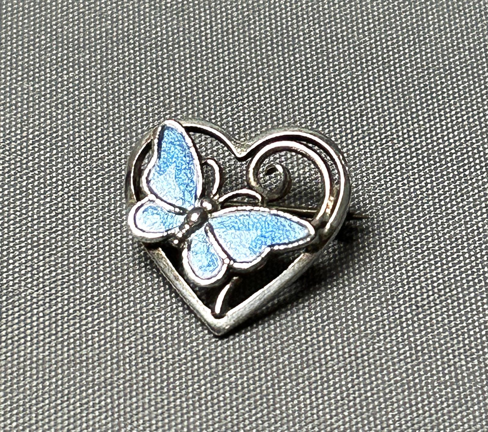 Petite Danish Silver & Enamel Butterfly Heart Brooch