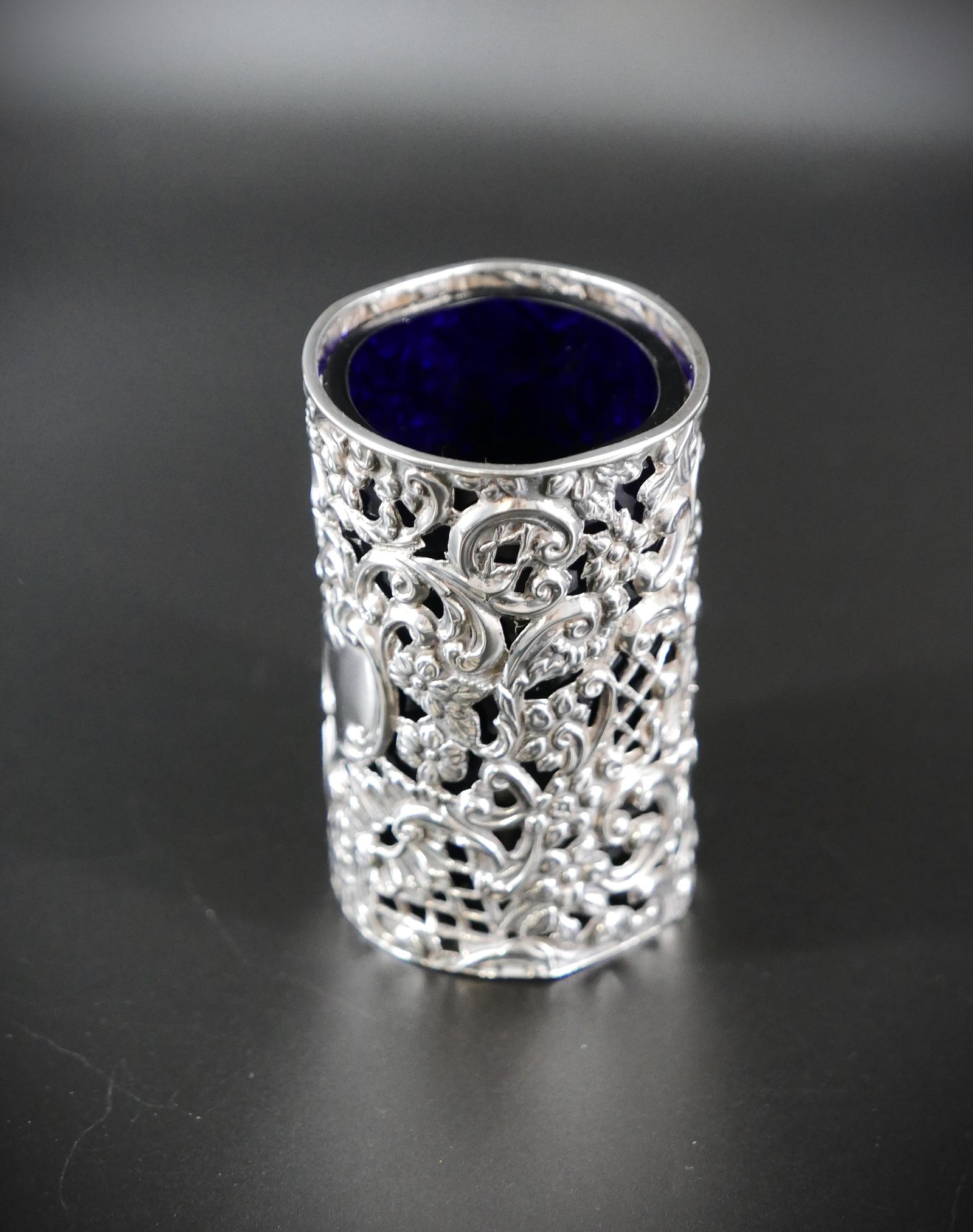 Pierced Repousse Silver Posy Vase with Heavy Bristol Blue Liner - Henry Matthews B'ham 1899