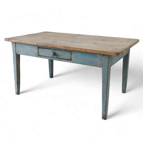 Pine Farmhouse Table Scrubbed Top Blue Painted Base Single Drawer