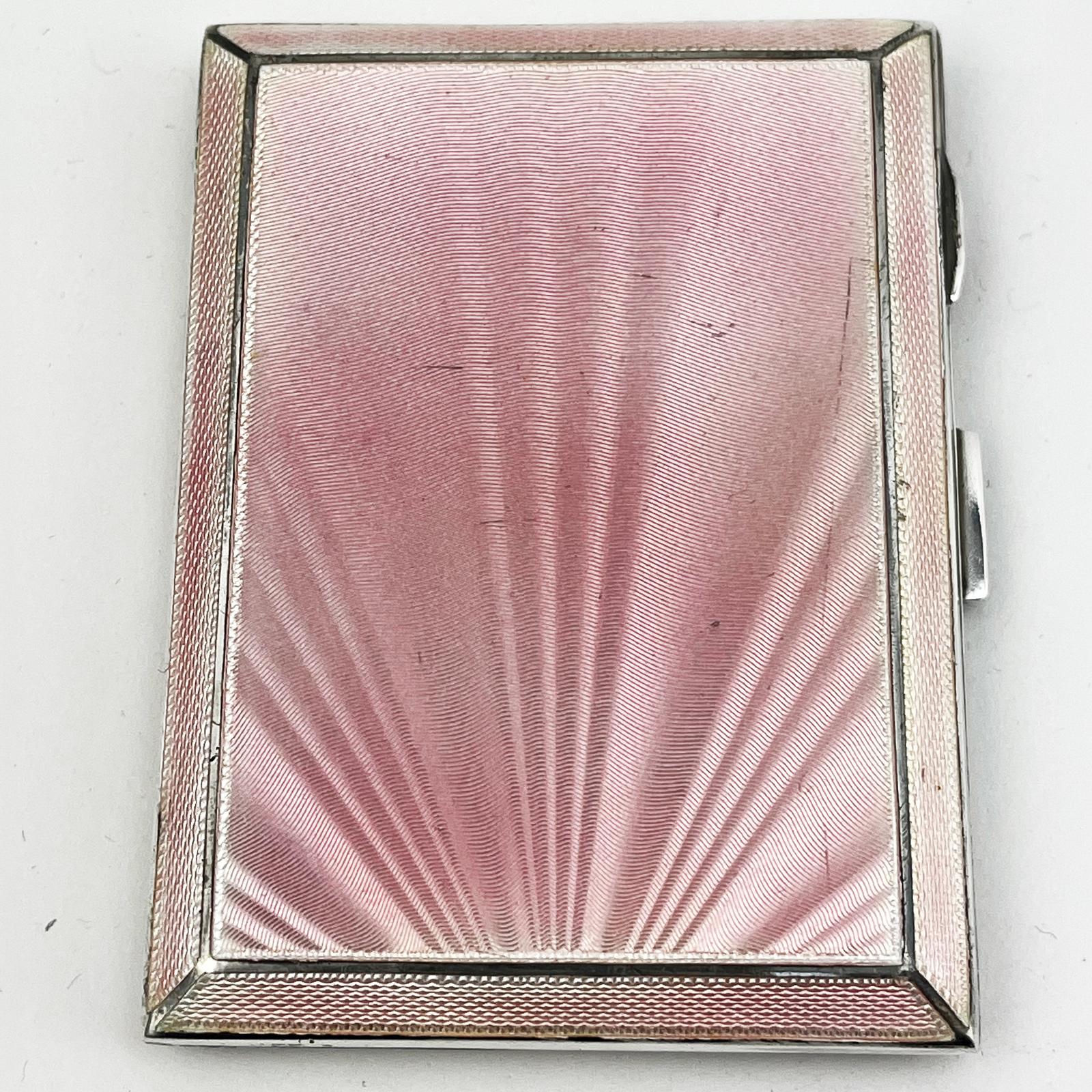 A beautiful pink enamel sterling silver card or cheroot case. In a rectangular form hinged lid with a pink enamel hinged lid with a sunburst pattern. The back has an engine turned pattern with a beautiful engraved family crest. The interior has been gilt and has an engraved dedication. The enamel is in perfect condition but the back has one very tiny bruise as shown.