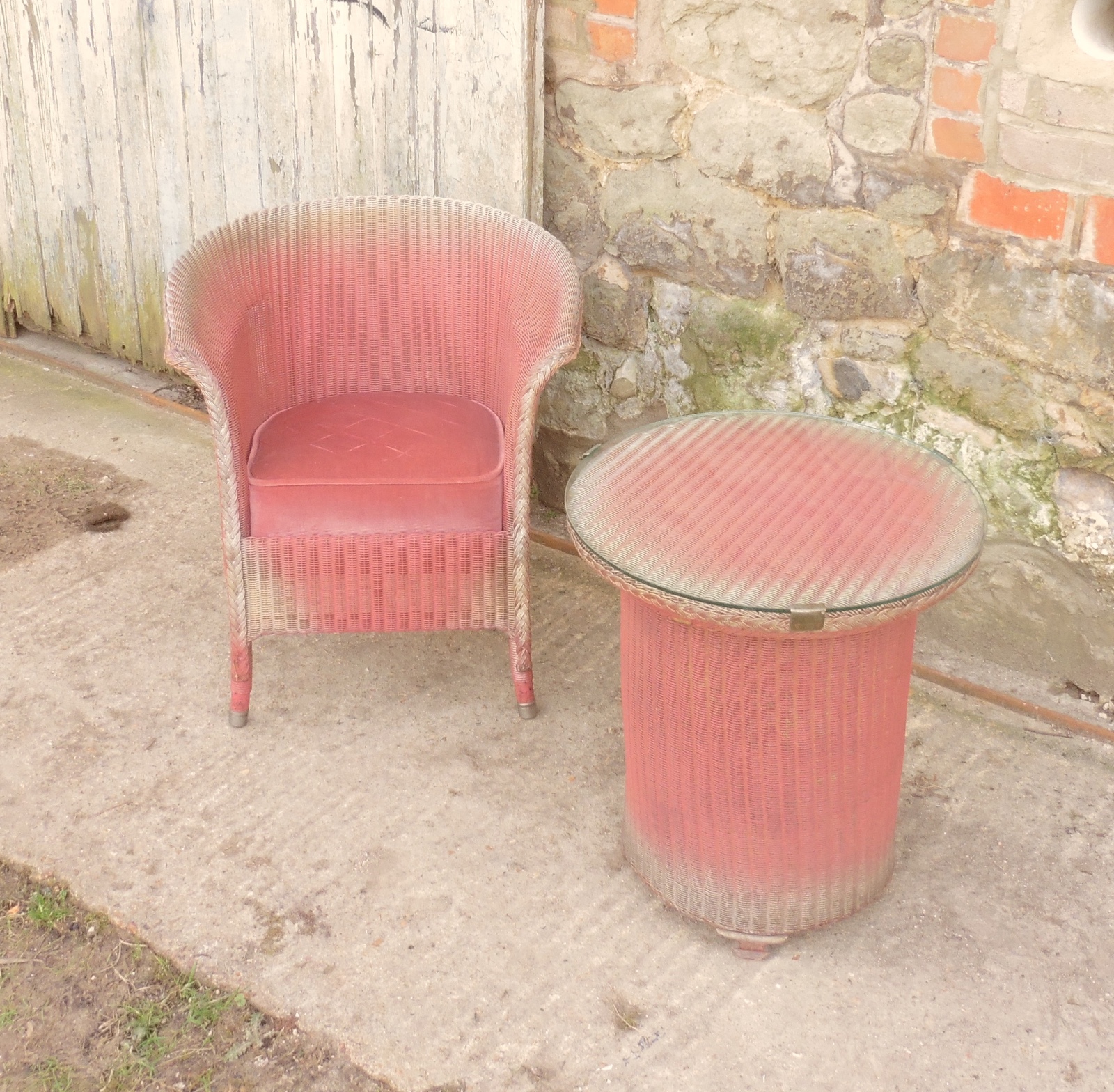 Pink Lloyd Loom Easy Chair, Matching Table & Laundry Basket c.1920