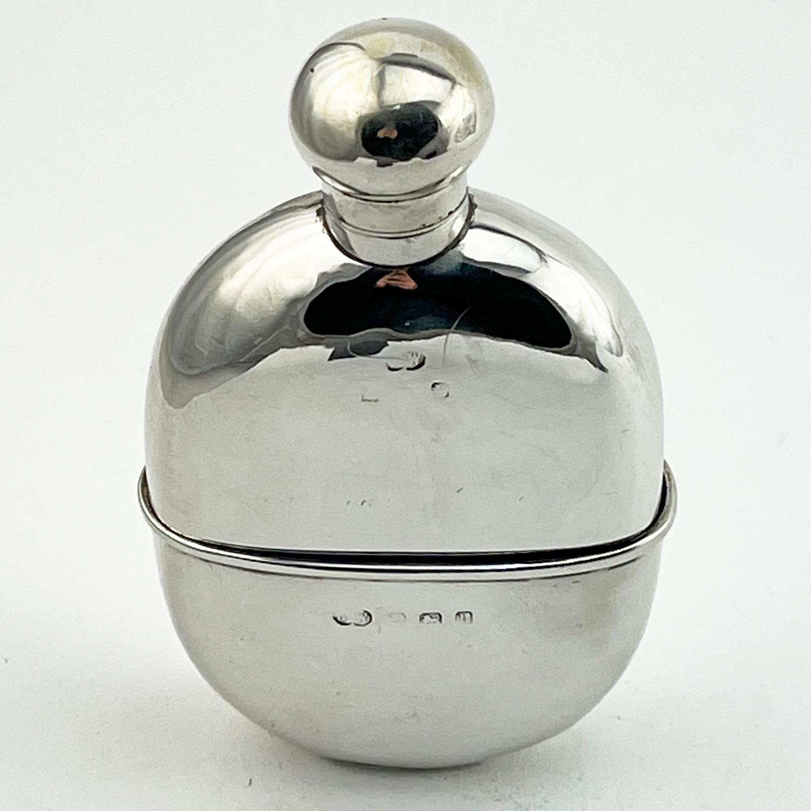Plain Edwardian (1907) sterling silver hip flask. In an oval shape plain curved body with a bun style shaped bayonet style screw down lid and a gilt lined detachable pull off cup. Very good original condition without any inscriptions. Capacity: 4 Fl Oz