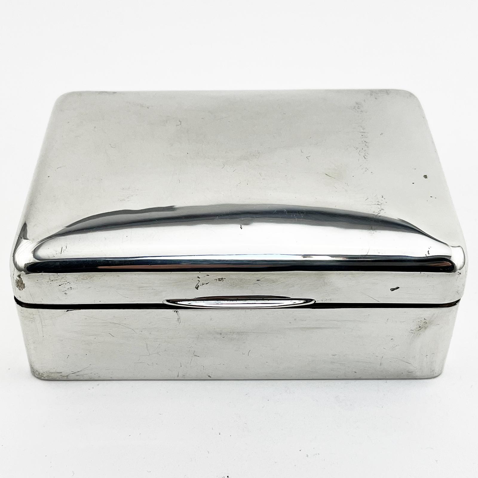 A very smart plain sterling silver trinket or cigarette box. With a plain domed hinged lid without any inscriptions, cedar wood lined interior and a plain body. Very good original used condition.