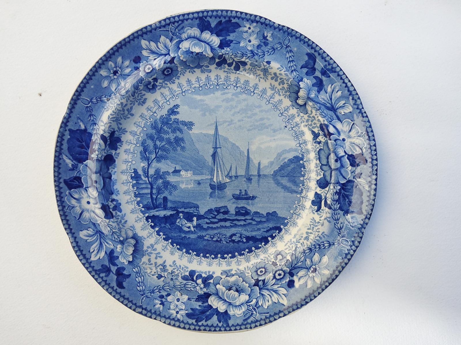 19th Century blue and white pearlware plate by Pountney & Goldney / Allies, transfer printed with a central view of St Vincent Rocks. This is part of the Bristol Views series depicting various views along the River Avon. Central view shows St Vincent Rocks and various sailing ships and a rowing boat on the Avon. Surrounded by a floral border to a lobed rim. Location is inscribed to the base of the plate.