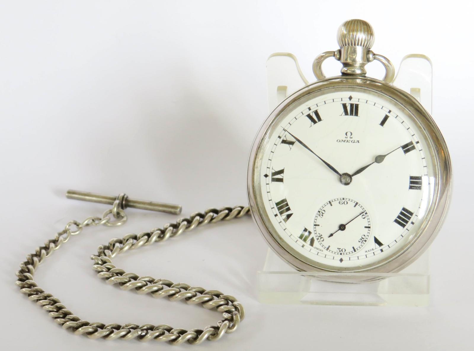 Pocket Watch: 1920s Silver Omega Pocket Watch and Chain