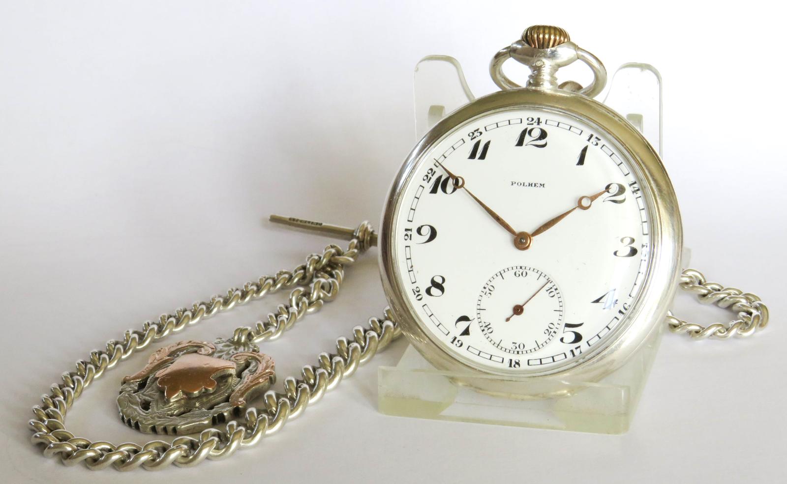 Pocket Watch : 1920s Silver Polhem Pocket Watch and Chain