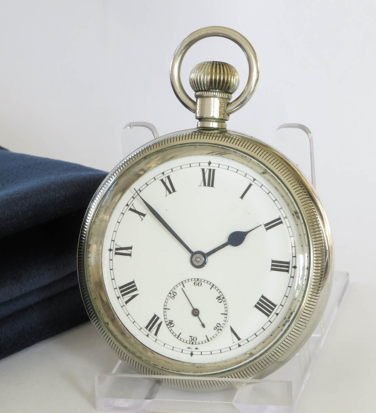 The watch measures 54mm diameter excluding the winding stem and the loop. The case is nickel and it is in good condition, just a minor indentation to the screw-on back. The back of the watch has the initials LMS for London, Midland & Scottish Railway, a British railway company formed on 1 January 1923 under the Railways Act 1921.