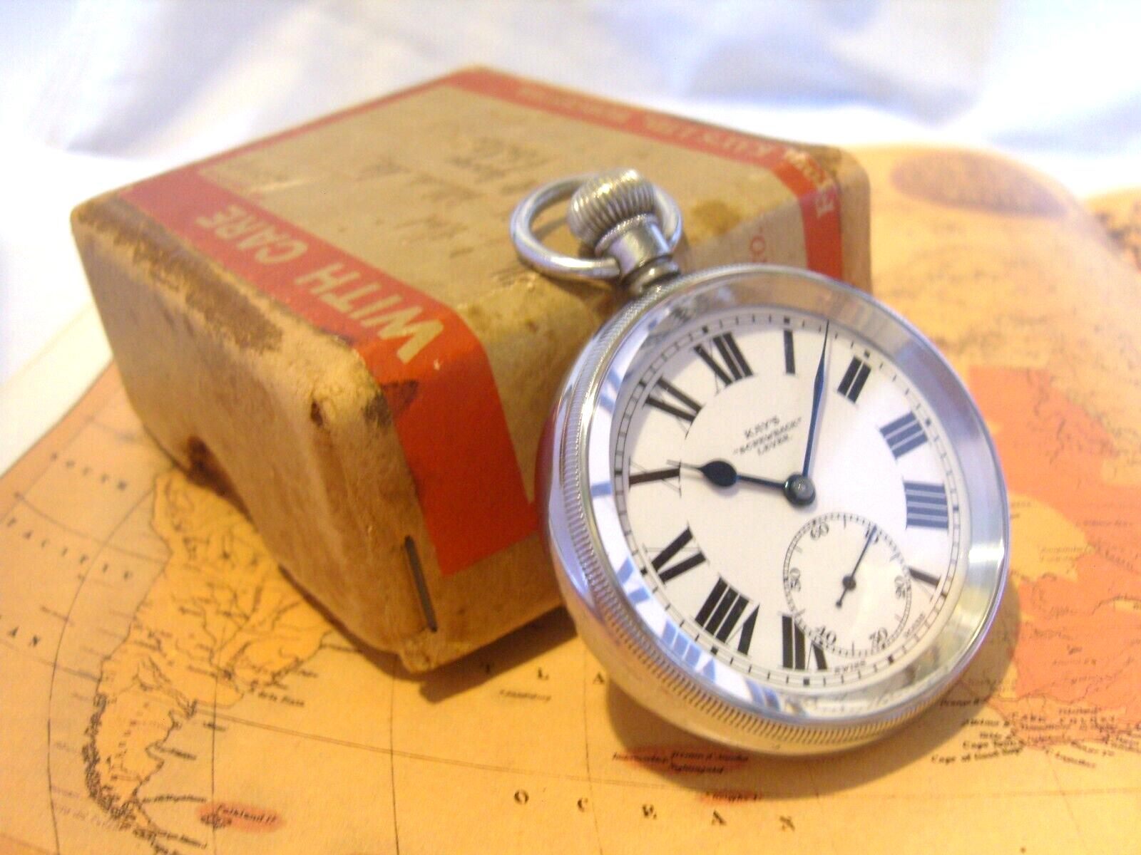 Pocket Watch 1940s Vintage Kay & Co Swiss 15j Movement Large Chrome Case Org Box