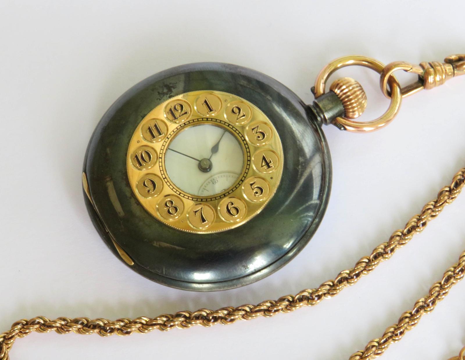Pocket Watch: Antique Alpine Gun Metal and Gold Half Hunter Pocket Watch & Chain