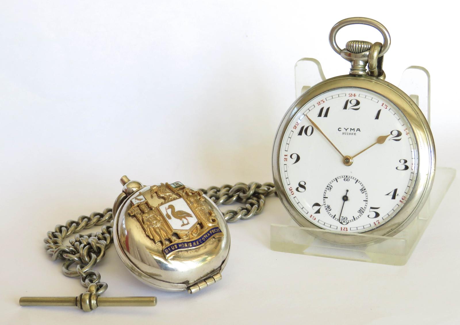 Pocket Watch: Antique Cyma Pocket Watch, Chain & Liverpool Sovereign Holder