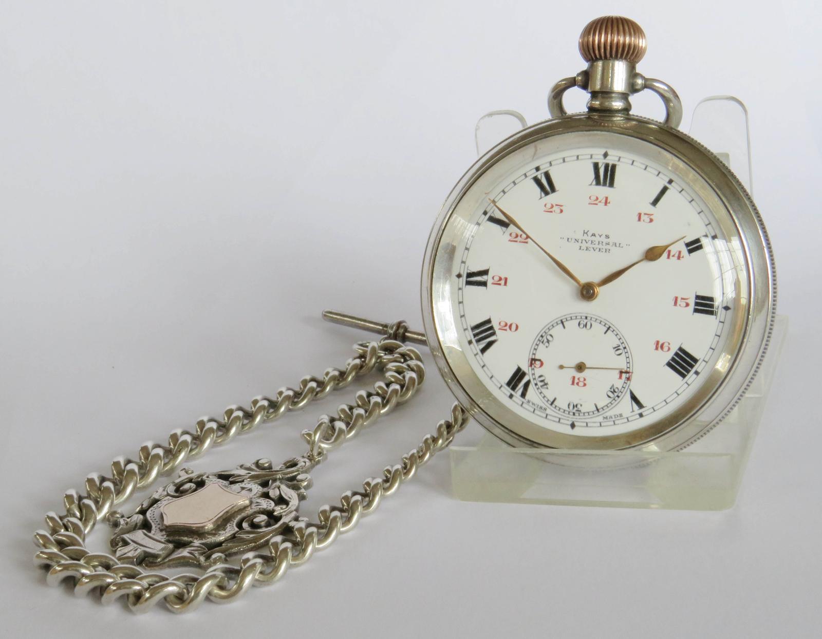 Pocket Watch: Antique Kays “Universal” Lever Silver Pocket Watch & Chain
