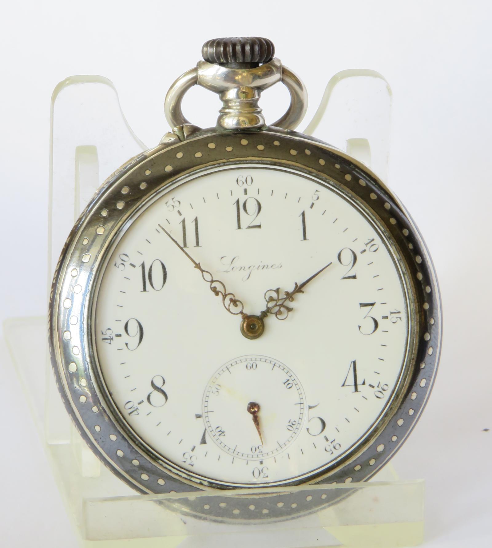 Pocket Watch: Antique Longines Silver Niello Pocket Watch