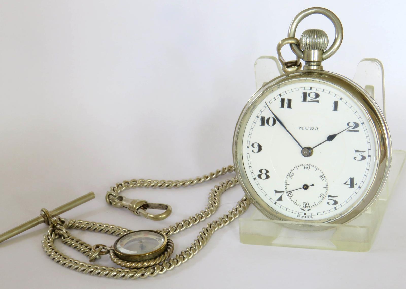 Pocket Watch: Antique Pocket Watch & Chain with Compass Fob