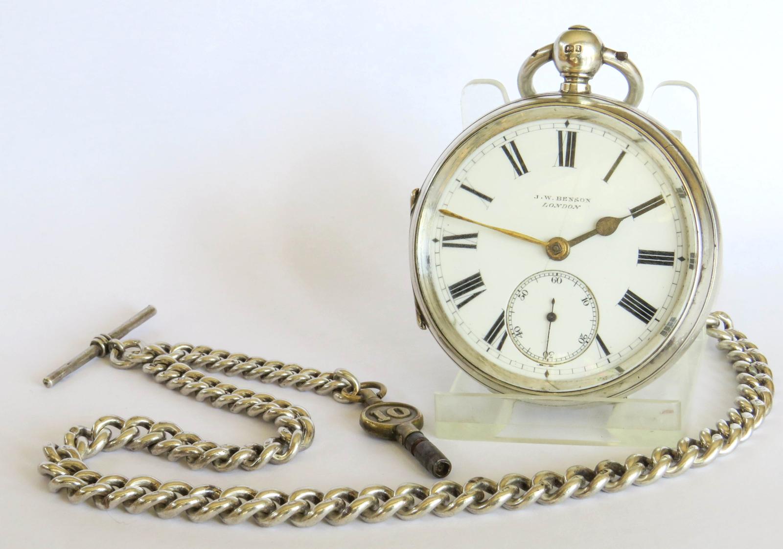 Pocket Watch: Antique Silver Benson Fusee Pocket Watch & Chain