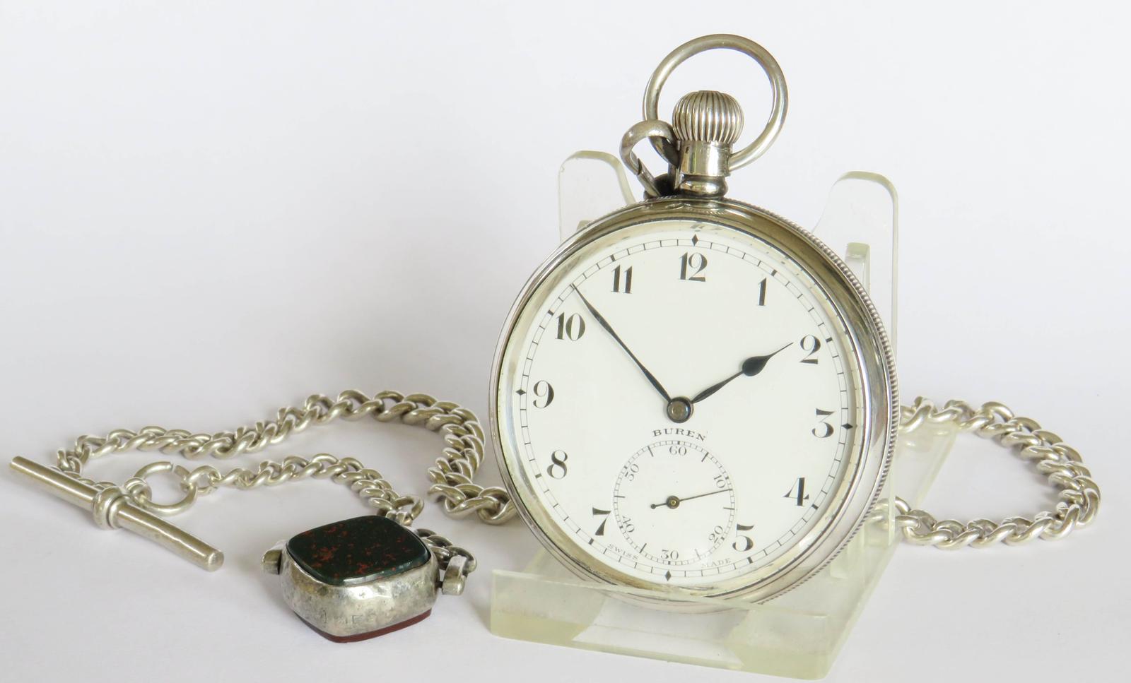 Pocket Watch: Antique Silver Buren Pocket Watch & Chain